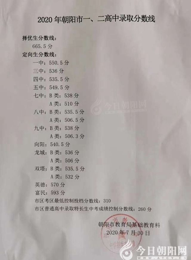 7月30日,朝陽市教育局公布了2020年朝陽市一、二高校區(qū)錄取分?jǐn)?shù)線,具體內(nèi)容如下: