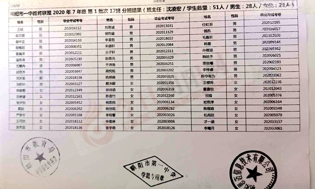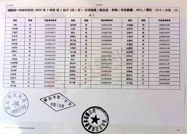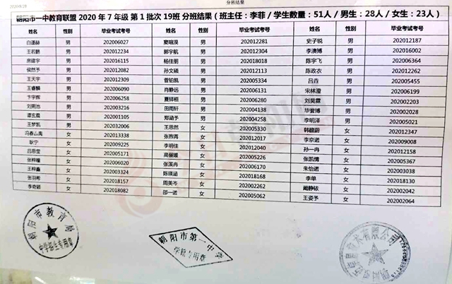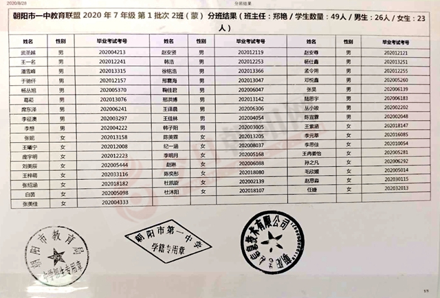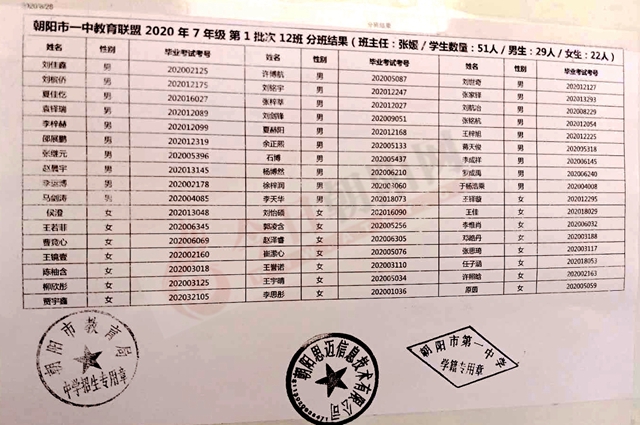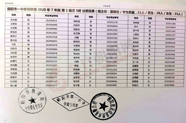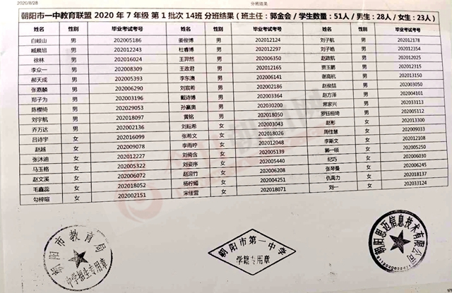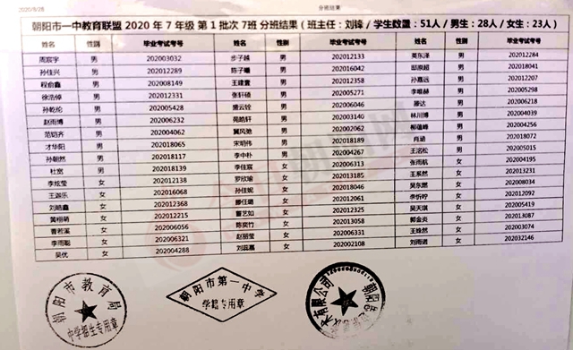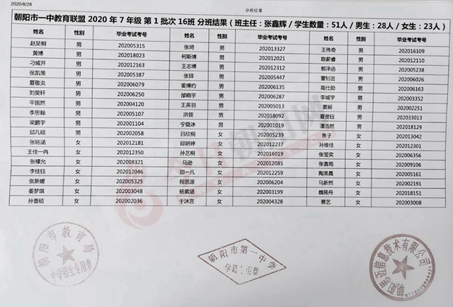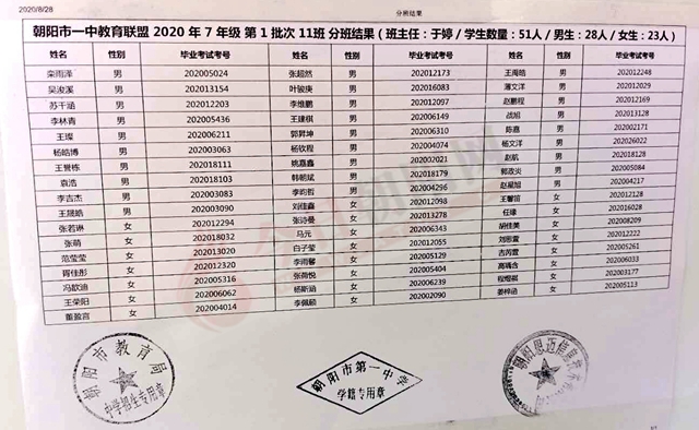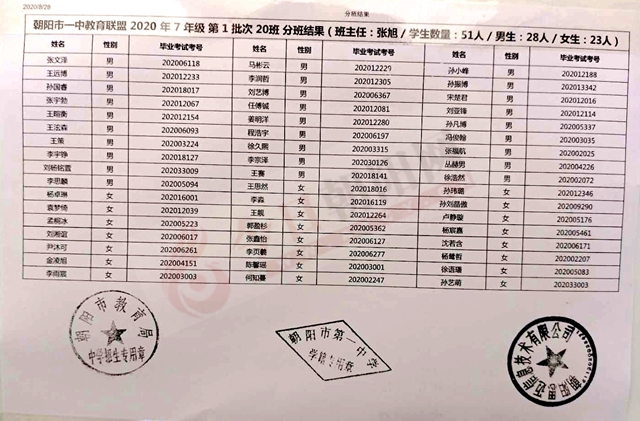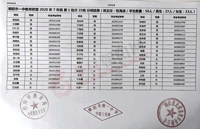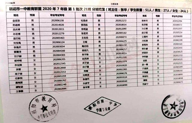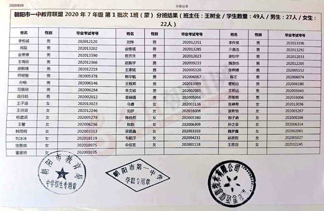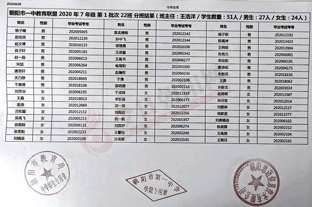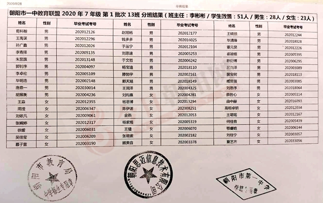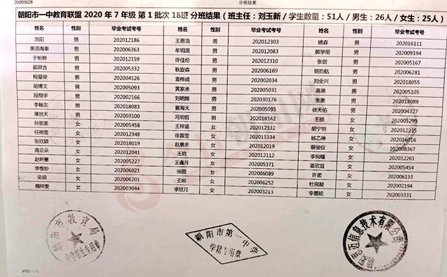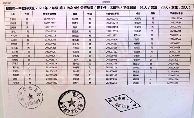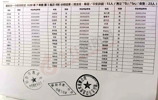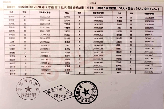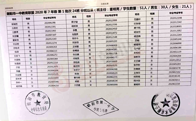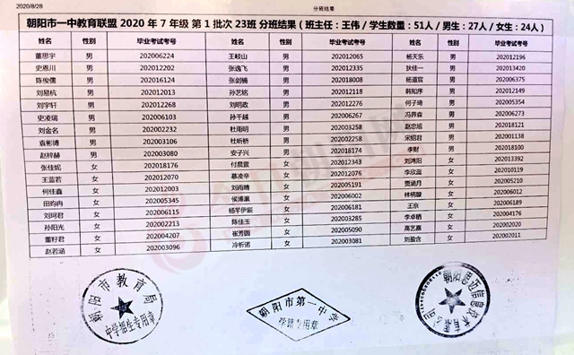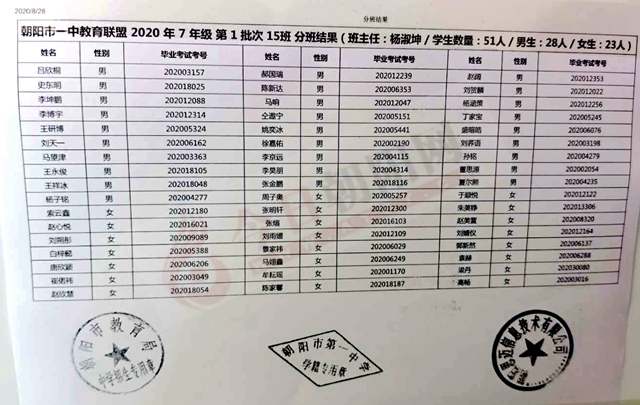 朝陽市一中教育聯(lián)盟2020年新生分班表(可點擊放大查看)