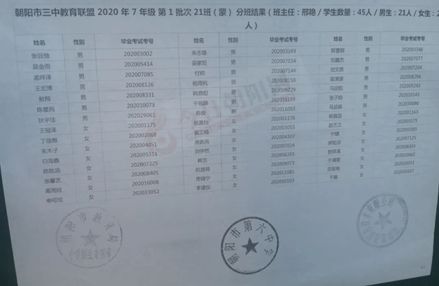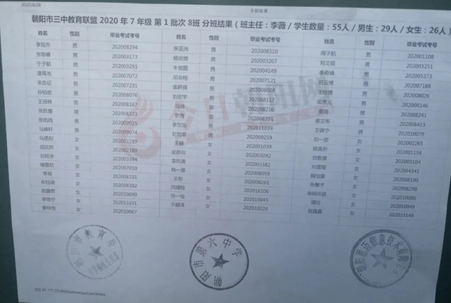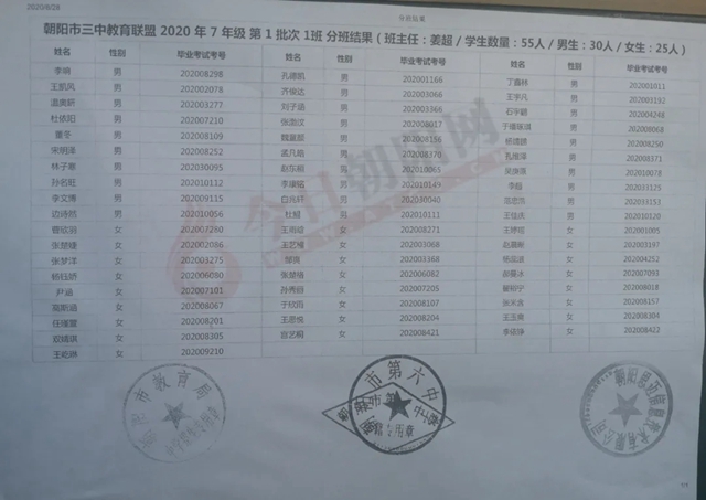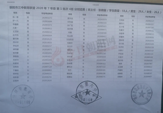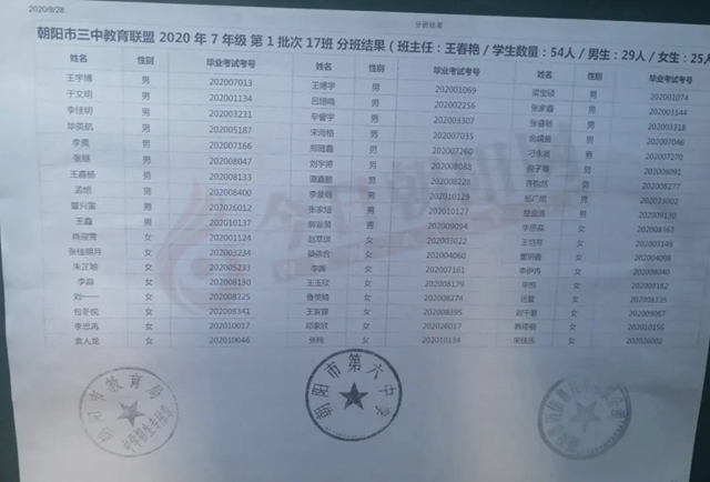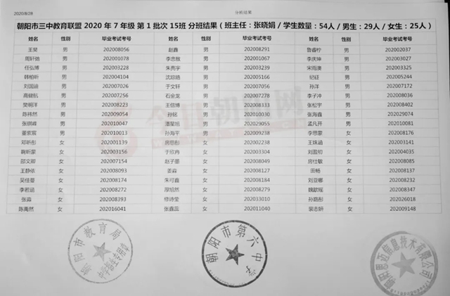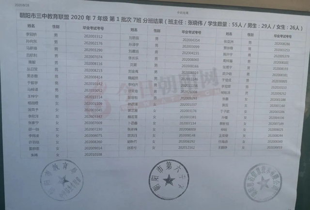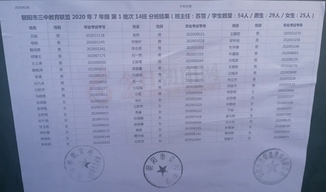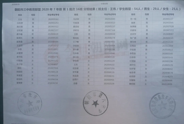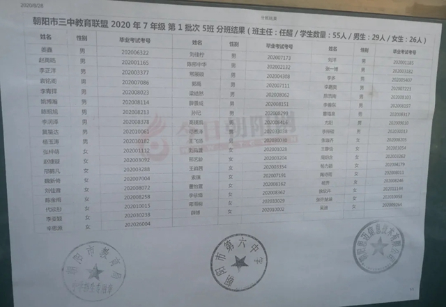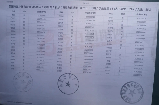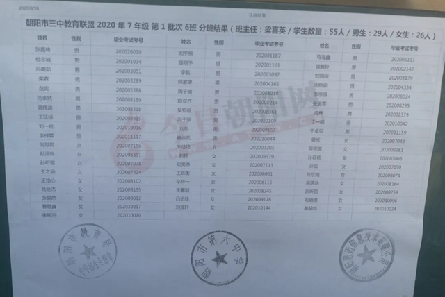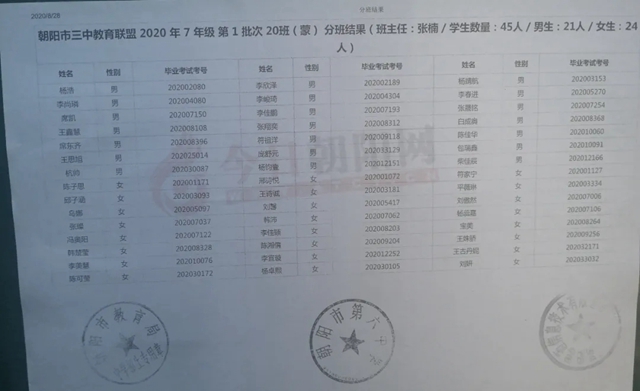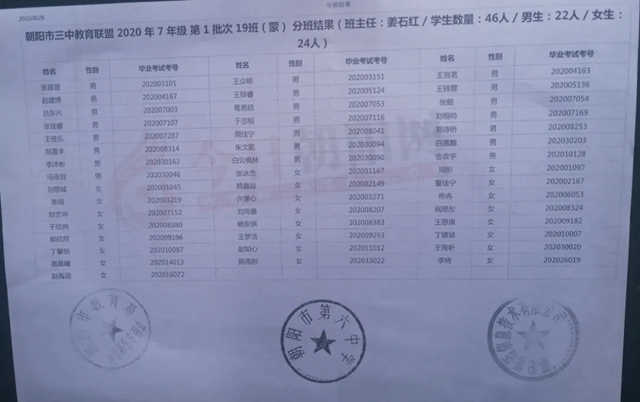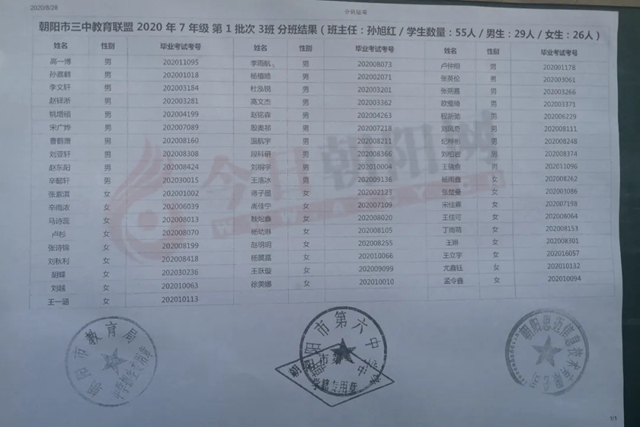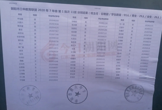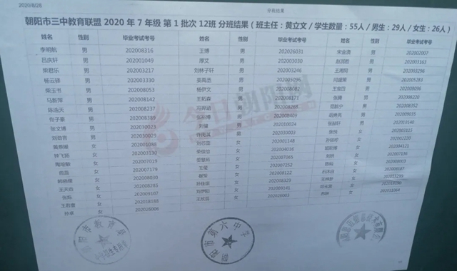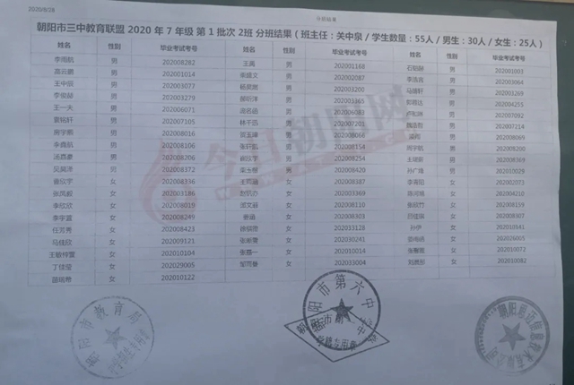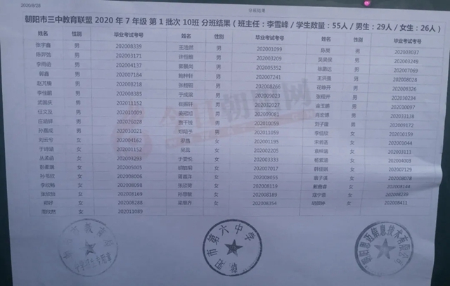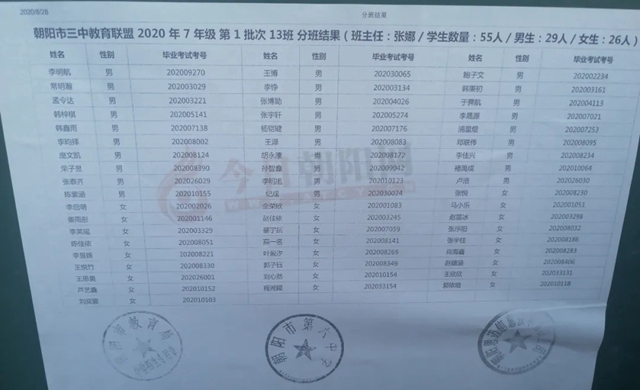 朝陽市三中教育聯(lián)盟2020年新生分班表(可點擊放大查看)