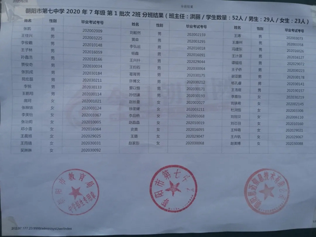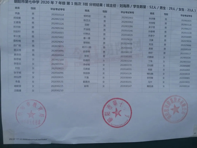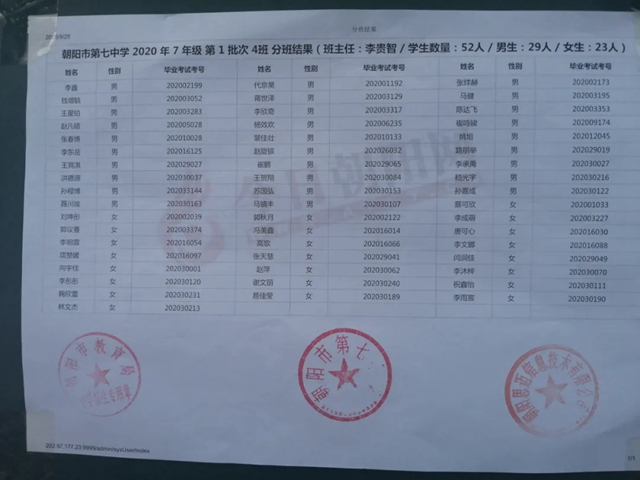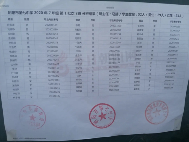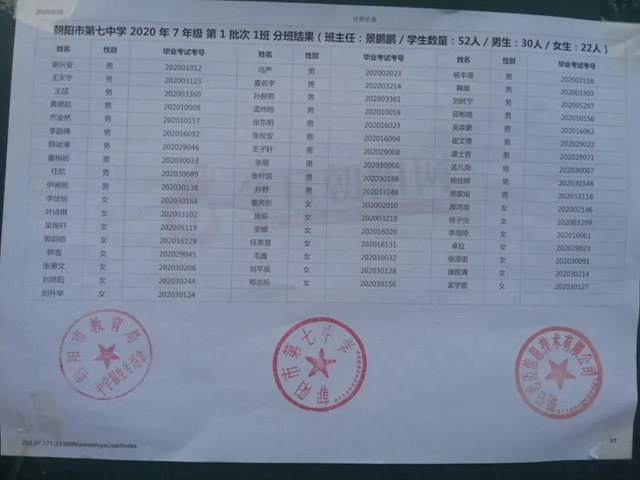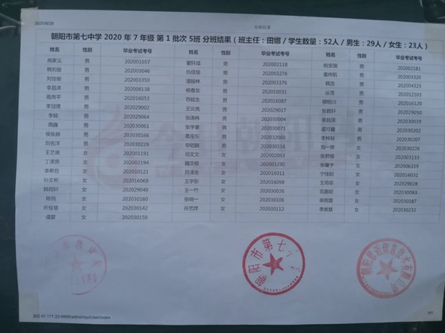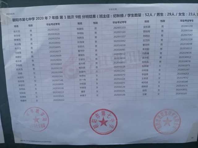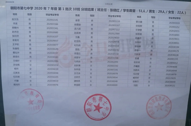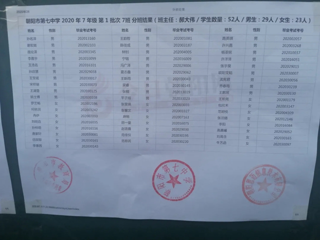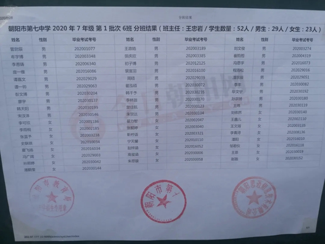 朝陽市第七中學2020年新生分班表(可點擊放大查看)