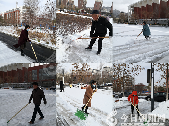 北風(fēng)卷著時斷時續(xù)的雪粒寒意十足,也未減少教職工除雪的熱情,他們拿著雪鏟,自動分成若干個組,有的在辦公樓前,有的在教學(xué)樓前,有的在圖書館前,或獨(dú)自打掃一片,或幾個人把雪鏟連在一起共同推雪,大家一邊除雪,一邊有說有笑地進(jìn)行溝通與交流,整個校園變得熱鬧不已。