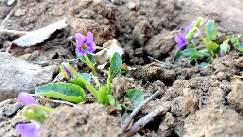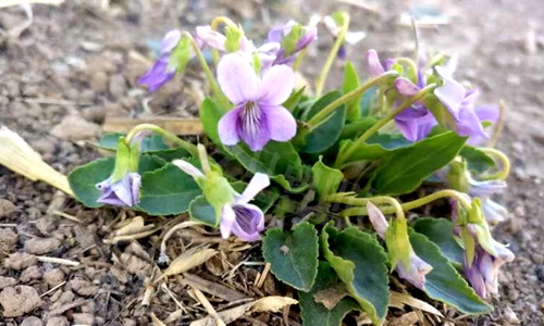 蹲下身子仔細(xì)看,原來是紫花地丁。紫花地丁是草本植物,別名野堇菜或光瓣堇菜,民間也叫堇堇菜。紫花地丁花果期為四月中下旬至九月,可作觀賞花卉,嫩葉可作野菜,全草可入藥,有涼血消腫、清熱利濕的功效。