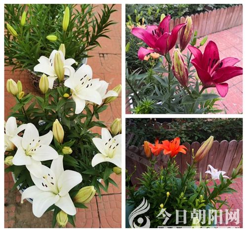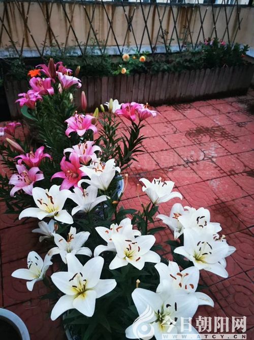 木板柵欄里面和外面各種各樣的花競(jìng)相開放,簡(jiǎn)直就是一幅活的畫,枝蔓攀爬花架,不僅襯托了畫面的主體,同時(shí)也增添了畫面的意境,極具空間感與藝術(shù)性。我不禁想到:“好花開遍玉欄桿,挈伴拖橈淺水灘。但笑紅霞遇池面,不知嬌面早先丹。” 回眸一笑百媚生,色彩奇多鬧天臺(tái)。一朵朵百合花有白色的、黃色的、粉色的、橙色的……微風(fēng)如約而至,白百合歡笑在天臺(tái)的懷抱,一會(huì)兒伸展著綠葉,訴說(shuō)嬌艷欲滴,一會(huì)兒吹奏著似喇叭一樣的花朵,歌唱秀麗多姿;黃百合玩耍在天臺(tái),一會(huì)兒綠葉涌動(dòng),傳唱純潔靚麗,一會(huì)兒翻卷著似風(fēng)鈴一樣的花朵,歌頌熱烈與豪放;粉百合嬉戲在天臺(tái),一會(huì)兒綠葉擁擠著,吟唱甜美與多情,一會(huì)兒舞動(dòng)著似漏斗一樣的花朵,傳頌深情與智慧;橙色百合舞蹈在天臺(tái),一會(huì)兒綠葉勁舞著,揮灑熱情與灑脫,一會(huì)兒簇?fù)碇苹ɑ@一樣的花朵,喧囂奮發(fā)與力量。
