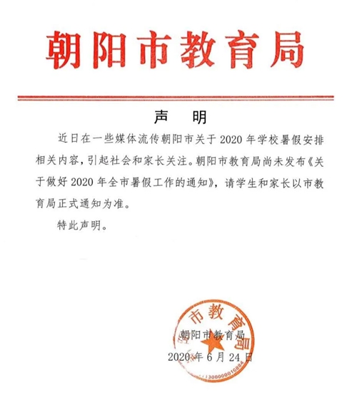 摘要:今日,一些微信公眾號(hào)發(fā)布了“朝陽(yáng)中小學(xué)暑假時(shí)間公布”一文,經(jīng)朝陽(yáng)市教育局聲明,該內(nèi)容不屬實(shí),該局尚未發(fā)布《關(guān)于做好2020年全市暑假工作的通知》。