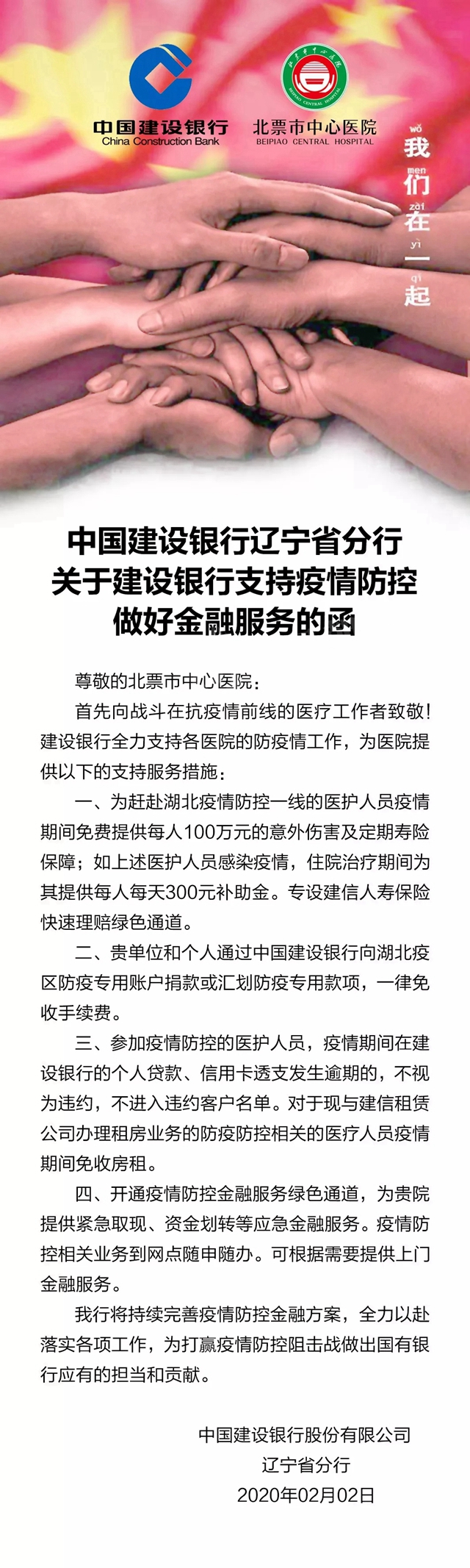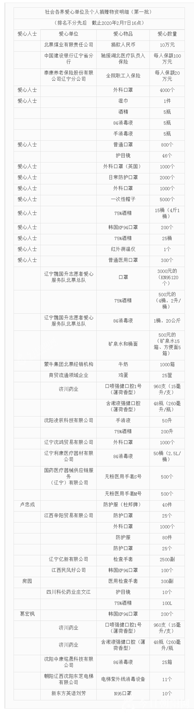 2月8日上午,本網(wǎng)小編從遼寧省北票市中心醫(yī)院了解到:自該院1月31日發(fā)出接受社會捐贈公告后,得到了社會各界人士的慷慨解囊。北票煤業(yè)有限責任公司無私捐贈10萬元,用于購買防疫物資;中國建設銀行遼寧省分行發(fā)函全力支持醫(yī)院防疫工作,為打贏疫情防控阻擊戰(zhàn)貢獻力量;蒙牛集團北票經(jīng)銷機構為一線醫(yī)護人員送來1000箱牛奶補充體力;還有多家單位、個人為醫(yī)院奉獻愛心(見下面明細表),彰顯了社會責任與擔當。