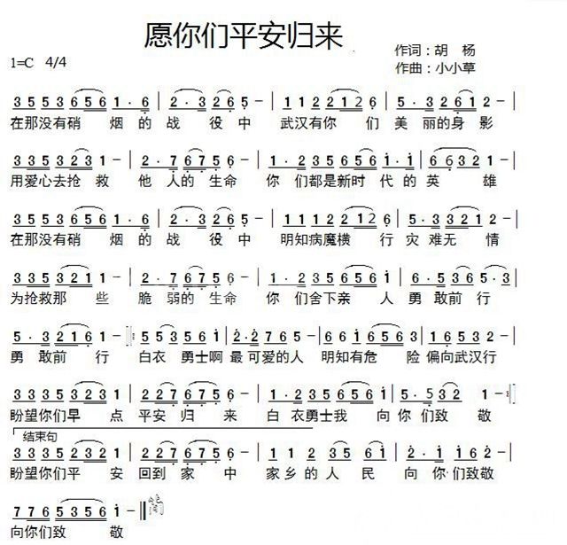 有感之余,我拿起手機(jī)打出了這幾行字,接著便有了《愿你們平安歸來》這首歌詞。河北邯鄲的小小草女士看到歌詞后,立即就流淌出了這首歌的感人旋律,很快就譜成了歌曲。之后又找到了知名歌手琴琴女士,錄制演唱了這首歌。今天,我把這首歌獻(xiàn)給在武漢雷神山醫(yī)院戰(zhàn)斗的6位白衣勇士,希望能給你們帶去鼓勵(lì),白衣勇士我向你們致敬!
