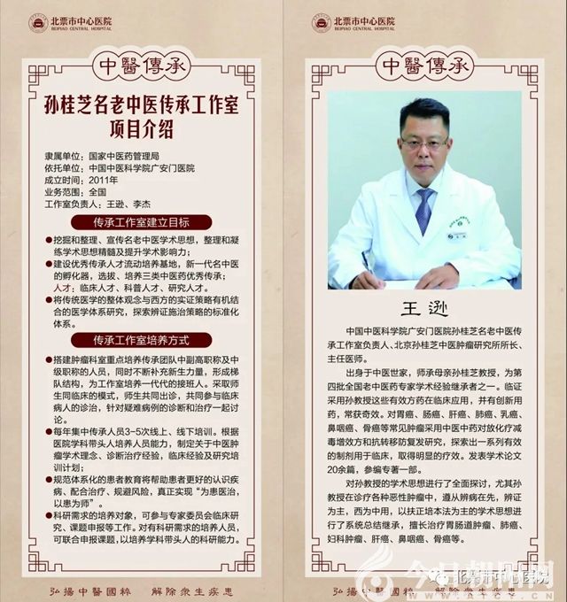 孫桂芝名老中醫(yī)傳承工作室以孫桂芝教授的兒子、第一批徒弟王遜為首。王遜,醫(yī)學(xué)研究生,第四批全國老中藥專家學(xué)術(shù)經(jīng)驗(yàn)繼承者之一,主任醫(yī)師,在拜師學(xué)習(xí)后對(duì)孫教授的學(xué)術(shù)思想進(jìn)行了全面探討。尤其是孫教授在診療各種惡性腫瘤中,遵從辨病在先、辨證為主、西為中用、以扶正培本法為主的學(xué)術(shù)思想進(jìn)行了系統(tǒng)總結(jié)繼承。臨證采用孫教授這些有效方藥在臨床應(yīng)用,并有創(chuàng)新用藥,常獲奇效。
