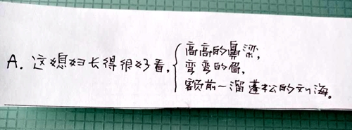 A.這媳婦長得很好看,高高的鼻梁,彎彎的眉,額前一溜蓬松的劉海。
