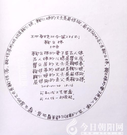 摘要:王中原繞口令第286則《鞠云梯》共六句話,寫了翁、嫗、女、婿、兒、媳六人姓名及相互關(guān)系。將六句話寫成環(huán)形,只點(diǎn)逗號,不畫句號,可以從任一句讀起。頂針部分也可以只寫一次。