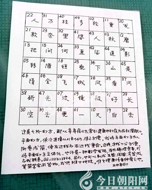 幻方,通稱縱橫圖,每行、每列以及對角線各數(shù)的和相等。下圖,單看數(shù)字是一個(gè)七階幻方。文字是辛棄疾《太常引•建康中秋夜為呂叔潛賦》,是我附加的。文字的順序與幻方的數(shù)字順序一致。