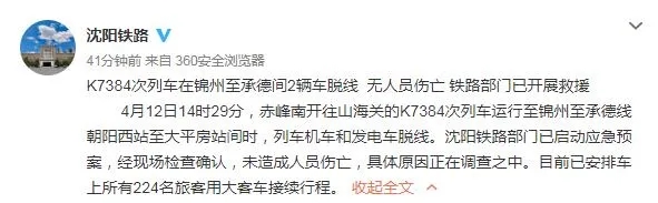 4月12日14時29分,赤峰南開往山海關的K7384次列車運行至錦州至承德線朝陽西站至大平房站間時,列車機車和發(fā)電車脫線。沈陽鐵路部門已啟動應急預案,經(jīng)現(xiàn)場檢查確認,未造成人員傷亡,具體原因正在調查之中。目前已安排車上所有224名旅客用大客車接續(xù)行程。