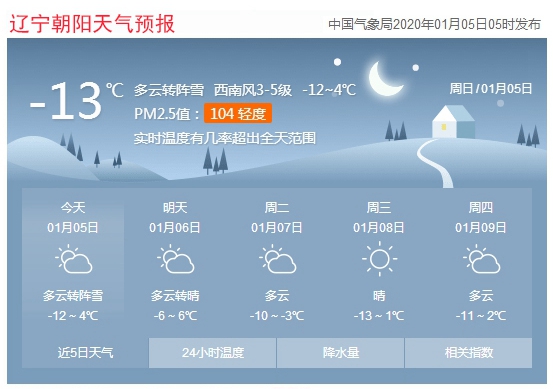 今天是2020年1月5日,星期日,農(nóng)歷臘月十一,二九第六天。遼寧朝陽多云轉(zhuǎn)陣雪,氣溫-12~4℃,西南風(fēng)3~5級,空氣質(zhì)量輕度污染。日出時(shí)間:07:25;日落時(shí)間:16:41(中國氣象局2020年1月5日5時(shí)發(fā)布),請隨時(shí)關(guān)注天氣變化。