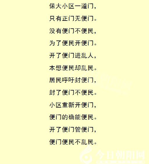 高速度的城市建設(shè),不僅提高了城市品位,也大大地改善了市民的居住條件。但住宅小區(qū)里大多沒(méi)有超市、糧站、托兒所……居民不得不經(jīng)常去市里買(mǎi)些生活必需品。細(xì)心的作者發(fā)現(xiàn),有的小區(qū)僅有一道門(mén)供人車(chē)出入,只有正門(mén)沒(méi)有便門(mén)。沒(méi)有便門(mén)給居民出入小區(qū)帶來(lái)很多不便,居民紛紛向小區(qū)物業(yè)部門(mén)提意見(jiàn),要求增設(shè)便門(mén)。