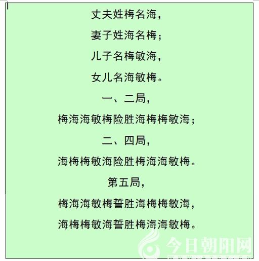 梅海是某廠的工程師,五十郎當(dāng)歲,體格健壯,渾身有使不完的勁兒;妻子海梅是某小學(xué)體育教師,身材高挑,健步如飛;兒子梅敏海和女兒海敏梅大學(xué)畢業(yè),先后回家鄉(xiāng)卓陽(yáng)工作。