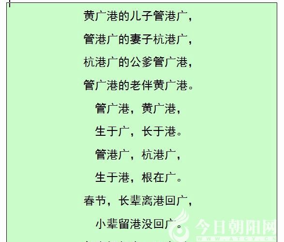 人物命名看似雜亂無章離奇古怪,但為了滿足繞口令文體要求,不得不然。剝開表象外衣,四個名字是很有規(guī)律的。老一輩兒,翁為管廣港、嫗為黃廣港;小一輩兒,子為管港廣、媳為杭港廣。姓名中含身世,別具匠心。