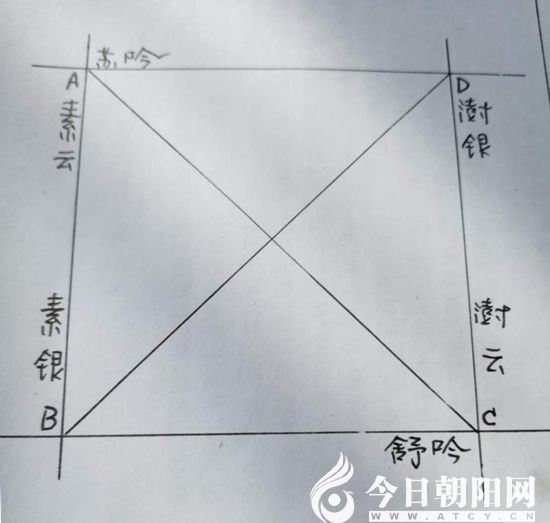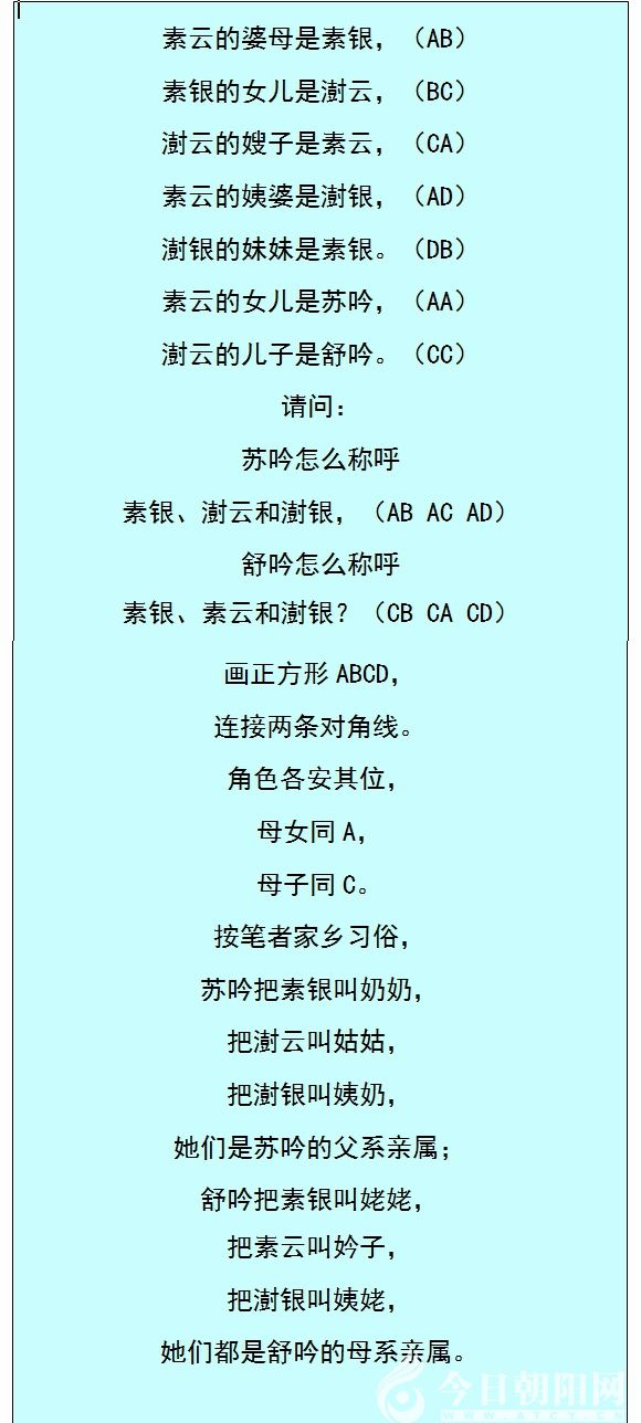 中原老師的繞口令可謂別具一格,有時(shí)簡單事情復(fù)雜寫,有時(shí)復(fù)雜問題簡單寫。他寫的《稱呼》一文中有六個(gè)角色。兩位老年,兩位中年,兩位少年。往簡單寫,很容易。他偏偏畫個(gè)正方形ABCD,還有兩條對角線AC、BD。素云左上角A,婆婆左下角B,小姑右下角C,姨婆右上角D。敘述順序是ABCADB,酷似一筆寫成的“區(qū)”字。A旁有素云之女蘇吟,C旁有澍云之子舒吟。