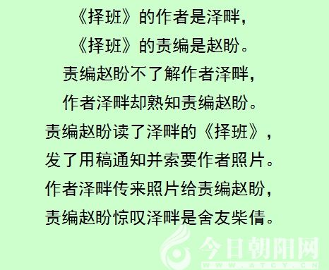 《擇班》的作者是澤畔,《擇班》的責(zé)任編輯是趙盼。趙盼不了解作者澤畔何許人也,但作者澤畔卻十分了解責(zé)編趙盼,深知趙盼在工作上,秉公辦事,新老作者一視同仁。責(zé)編趙盼按有關(guān)標(biāo)準(zhǔn)采用了澤畔的《擇班》,并發(fā)了采用通知,索要了作者照片。作者澤畔從網(wǎng)上給責(zé)編趙盼傳來(lái)照片,趙盼一看照片連聲驚嘆,澤畔原來(lái)是舍友柴倩!