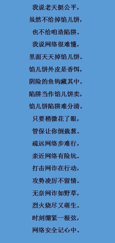 作者深感網(wǎng)絡(luò)這東西深奧、難懂,心里惴惴不安、不踏實(shí)。所以,這則順口溜一開端,就對老天發(fā)出感嘆。用來無影去無蹤的網(wǎng)絡(luò)與抬頭可見的老天相比,覺得老天還是挺公平的,雖然不給咱掉餡兒餅,但也不給咱挖坑設(shè)陷阱。