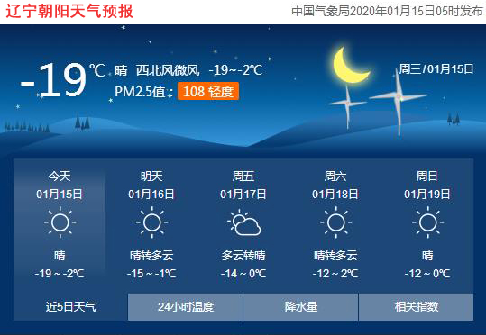 今天是2020年1月15日,星期三,農(nóng)歷臘月二十一,三九第七天。遼寧朝陽(yáng)晴,氣溫-19~-2℃,西南風(fēng)3~5級(jí),空氣質(zhì)量輕度污染好。日出時(shí)間:07:24;日落時(shí)間:16:51(中國(guó)氣象局2020年1月15日5時(shí)發(fā)布),請(qǐng)隨時(shí)關(guān)注天氣變化。
