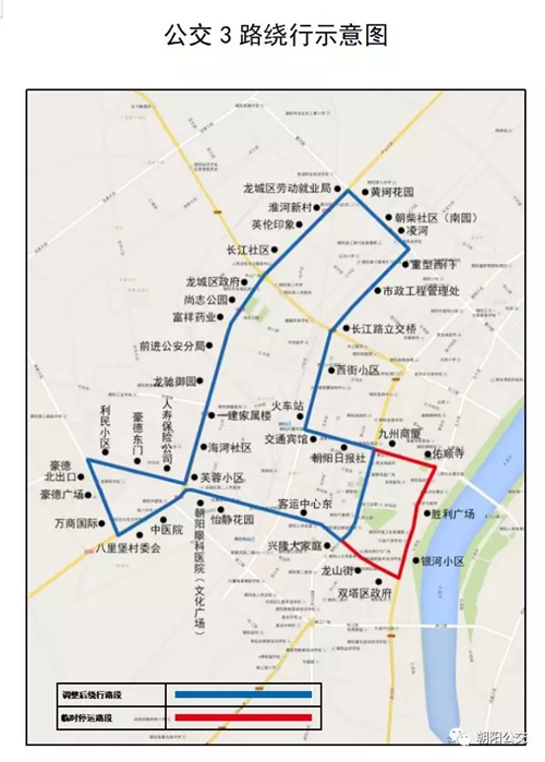 自2020年3月25日起至恢復(fù)通車期間,3路將繞行朝陽大街進(jìn)入新華路后恢復(fù)原線路運行,繞行后3路公交車將不再經(jīng)過龍山街、雙塔區(qū)政府、銀河小區(qū)、勝利廣場、佑順?biāo)?、九州商廈站點。