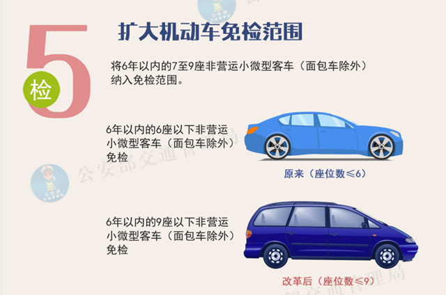 在實行6年內6座以下非營運小微型客車免檢基礎上,將6年以內的7至9座非營運小微型客車(面包車除外)納入免檢范圍。