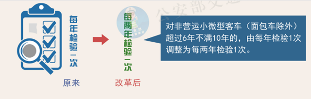 對非營運小微型客車(面包車除外)超過6年不滿10年的,由每年檢驗1次調整為每兩年檢驗1次。