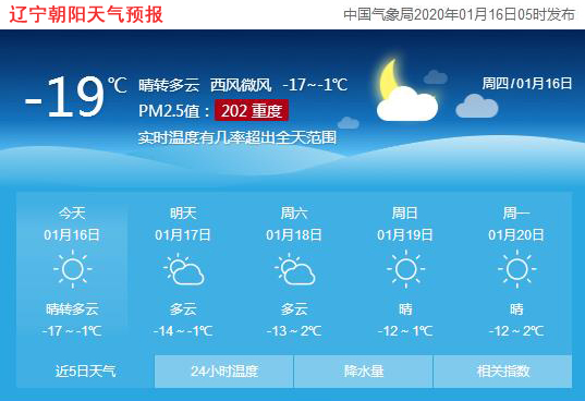 今天是2020年1月16日,星期四,農(nóng)歷臘月二十二,三九第八天。遼寧朝陽(yáng)晴轉(zhuǎn)多云,氣溫-17~-1℃,西南風(fēng)微風(fēng),空氣質(zhì)量重度污染。日出時(shí)間:07:23;日落時(shí)間:16:52(中國(guó)氣象局2020年1月16日5時(shí)發(fā)布),請(qǐng)隨時(shí)關(guān)注天氣變化。