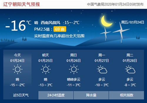 今天是2020年1月24日,星期五,農(nóng)歷臘月三十,四九第七天。遼寧朝陽晴,氣溫-15~-2℃,西南風(fēng)微風(fēng),空氣質(zhì)量良好。日出時(shí)間:07:19;日落時(shí)間:17:02(中國(guó)氣象局2020年1月24日5時(shí)發(fā)布),請(qǐng)隨時(shí)關(guān)注天氣變化。