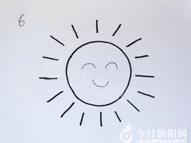 用彎曲的線,畫出太陽的眼睛和嘴巴。