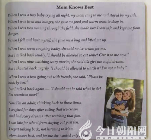 女兒學(xué)了一首小詩(shī)《Mom knows best》,我建議女兒看看《點(diǎn)撥》什么的,參考一下譯文。女兒搖搖頭說:“不,川說啦,自己翻譯出來的更有創(chuàng)意。不要讓那些教輔束縛了我們可以飛躍的思維。”女兒的小詩(shī)翻譯出來后,拿給我看,透過那些跳動(dòng)的字符,我似乎看到了她老班那溫暖而又滿含鼓勵(lì)的目光。