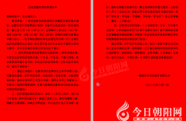 為最大限度地阻擊疫情,充分發(fā)揮群眾力量,同時有效開展疫情預(yù)防工作,安平保安公司向所有客戶、業(yè)主發(fā)出了《迎戰(zhàn)疫魔 共克時艱倡議書》,倡議大家要本著對自己和他人生命負責(zé)的態(tài)度,按照國家、遼寧省和朝陽市防控疫情領(lǐng)導(dǎo)小組的要求,加強防控,群防群控,全員有責(zé),從我做起。呼吁大家行動起來,共克時艱,努力建設(shè)健康幸福新朝陽,為進一步做好防控工作奠定了堅實基礎(chǔ)。