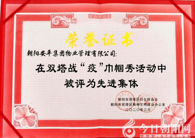 近期,遼寧朝陽(yáng)安平集團(tuán)在朝陽(yáng)市雙塔區(qū)婦聯(lián)、雙塔區(qū)精神文明辦開(kāi)展的“雙塔戰(zhàn)疫巾幗秀”主題活動(dòng)中,獲得了“雙塔戰(zhàn)疫巾幗秀”先進(jìn)集體榮譽(yù)稱號(hào)。