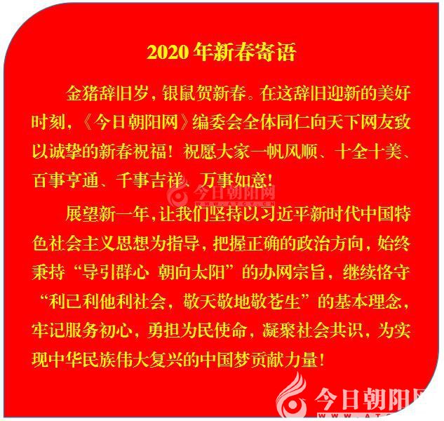 摘要:金豬辭舊歲,銀鼠賀新春。在這辭舊迎新的美好時(shí)刻,《今日朝陽網(wǎng)》編委會(huì)全體同仁向天下網(wǎng)友致以誠摯的新春祝福!祝愿大家一帆風(fēng)順、十全十美、百事亨通、千事吉祥、萬事如意!