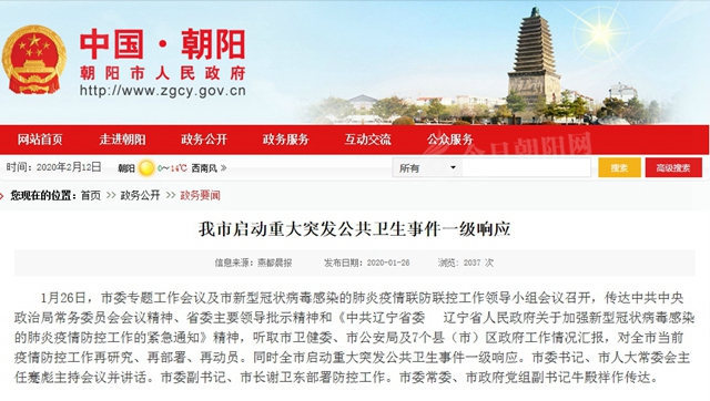 1月26日,按照遼寧省疫情防控有關(guān)要求,朝陽(yáng)市啟動(dòng)了重大突發(fā)公共衛(wèi)生事件一級(jí)響應(yīng),實(shí)行最嚴(yán)格的防控措施,保障人民群眾健康安全。