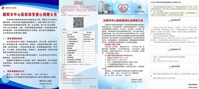 病毒無(wú)情人有情。日前,朝陽(yáng)地區(qū)各級(jí)醫(yī)療機(jī)構(gòu)先后發(fā)出了接受愛(ài)心捐贈(zèng)公告:防護(hù)保障物資告急,迫切需要開通社會(huì)捐贈(zèng)通道,公開接受社會(huì)各界的愛(ài)心捐贈(zèng)。公告發(fā)出后,社會(huì)各界人士積極響應(yīng),多家單位和個(gè)人為他們捐資捐物,讓奮不顧身戰(zhàn)斗在抗擊疫情一線的醫(yī)務(wù)人員倍感振奮,更增強(qiáng)了戰(zhàn)勝疫情的信心與決心。