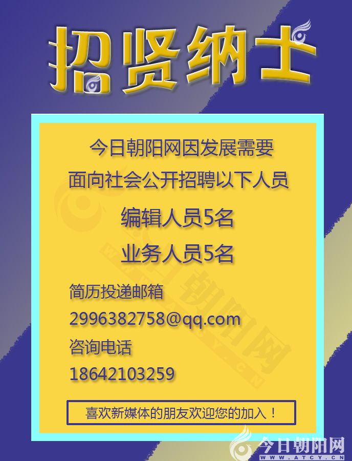今日朝陽(yáng)網(wǎng)開(kāi)始招聘啦!如果您喜歡新媒體這一行業(yè),并愿意把自己的追求定位在網(wǎng)絡(luò)前沿,可以自信地選擇今日朝陽(yáng)網(wǎng)的崗位來(lái)實(shí)現(xiàn)您的夢(mèng)想。