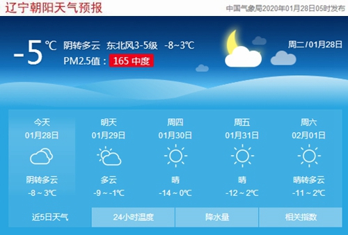 摘要:今天是2020年1月28日,星期二,農(nóng)歷正月初四,五九第二天。遼寧朝陽陰轉(zhuǎn)多云,氣溫-8~3℃,東北風(fēng)3~5級,空氣質(zhì)量中度污染。日出時間:07:16;日落時間:17:07。