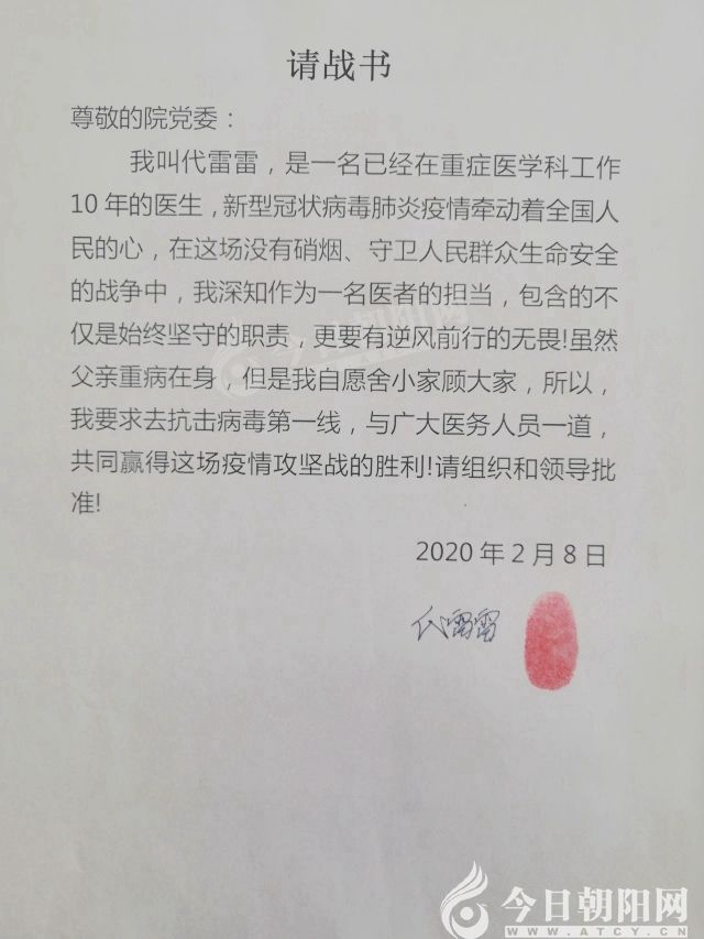 2月10日,國家衛(wèi)健委主任馬曉偉在講話中對新冠重癥患者救治發(fā)出了動員令,該院ICU醫(yī)護人員集體請戰(zhàn)到一線工作。同時,代雷雷又單獨提交了請戰(zhàn)書,表達了“國有難,召必至”的情懷和決心。這次出征,他有了直面病魔的機會,更有了保護患者健康的神圣使命。盡管父親有病在身還在治療中,盡管親人們對代雷雷的出行有些擔心,但最終父母和妻子對他的行動還是表示了支持和鼓勵。尤其是他的妻子,作為同一醫(yī)院心內(nèi)科的一名護士,與他有著共同的心愿:擊退病魔,戰(zhàn)勝疫情,讓人們早日摘掉口罩,露出燦爛的笑容。