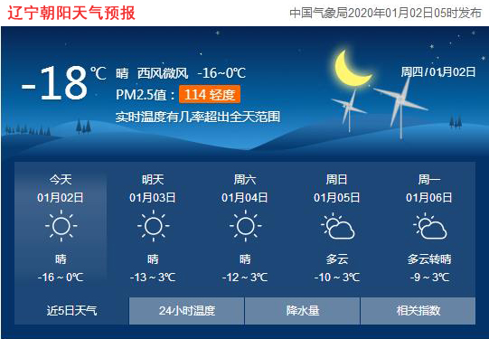 今天是2020年1月2日,星期四,農(nóng)歷臘月初八,二九第三天。遼寧朝陽(yáng)晴,氣溫-16~0℃,西北風(fēng)微風(fēng),空氣質(zhì)量輕度污染。日出時(shí)間:07:25;日落時(shí)間:16:38(中國(guó)氣象局2020年1月2日5時(shí)發(fā)布),請(qǐng)隨時(shí)關(guān)注天氣變化。