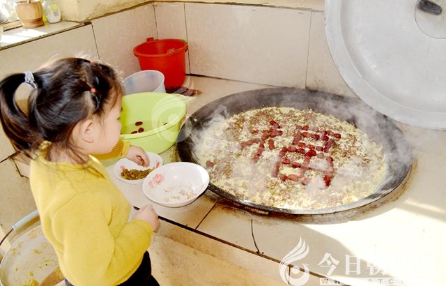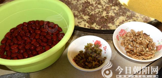 年糕的作法是將黃米面放盆內(nèi),摻水?dāng)嚢柚潦治彰婺艹蓤F(tuán)兒為宜。如果不成團(tuán)兒,往盆里用噴壺灑水,切記慢灑少灑,必須試著來,同時(shí)用筷子上下左右翻動(dòng),攪拌均勻,至手握成團(tuán)兒為止。然后,將大鐵鍋刷洗干凈,填足了水,放上用高粱秸稈做的篦簾子,篦簾子上鋪一層提前泡好的紅小豆、江豆、蕓豆、花生、核桃仁、大棗、葡萄干等食物,鄉(xiāng)親們稱這些為配料。第一層配料要放得密實(shí)一些,以確保拌好的黃米面不會漏進(jìn)鍋里。之后,用手把拌好的黃米面抓到配料上邊,放的時(shí)候要輕,放一層面,面上再放一層配料,這樣反復(fù)幾次,最后一層面用粗一點(diǎn)的籮篩找平,在平平的面上再用花生仁、青紅絲等有顏色的東西擺成“新年快樂”“連年有余”等祝福的文字,最后蓋嚴(yán)了鍋蓋。這個(gè)鍋蓋一定是用高粱秸稈制作的,這樣的鍋蓋透氣,不至于出鍋的時(shí)候年糕上邊都是水。這時(shí)候灶膛內(nèi)加火,正常情況都燒高粱秸稈。蒸年糕添火也是一門藝術(shù),要求是均勻還不糊鍋。當(dāng)整口鍋都散發(fā)著濃濃的水蒸氣后,調(diào)成小火再蒸大約60分鐘就熟了。