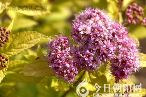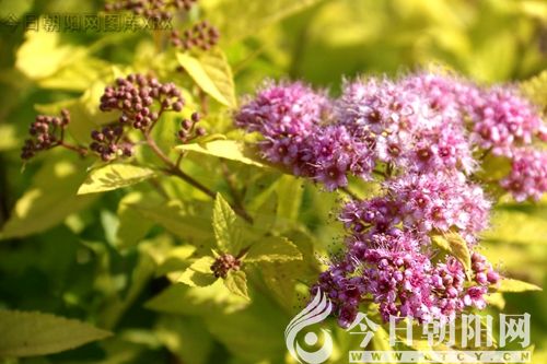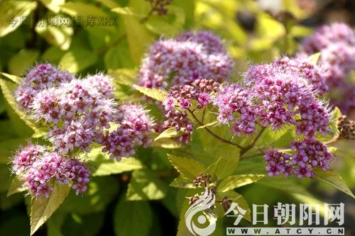 繡線菊的花期為6—7月,花色粉嫩嬌艷,花朵密集繁茂,在金黃色葉片的陪襯下典雅溫馨,清香雋永。繡線菊為小灌木,有分枝力強、耐修剪、花期長等優(yōu)點,成為人們美化城市,點綴園林較為推崇的綠植。