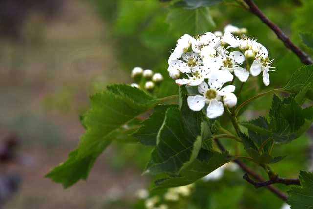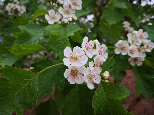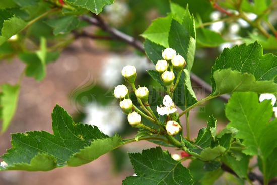 山楂花又叫山里紅花,薔薇科植物,山楂和山楂花是藥果兼用樹種。山楂花可生用或炒焦入藥,山楂果實被廣泛用于制造糖葫蘆、果丹皮、山楂餅等酸甜食物,很受人們的歡迎。山楂樹每年四月開花,一叢叢潔白的山楂花給人一種冰清玉潔之感,若是趕上雨季,雨滴落到花上,更顯得楚楚動人。到了八月,一串串紅紅的山楂就會掛滿枝頭,很是誘人。