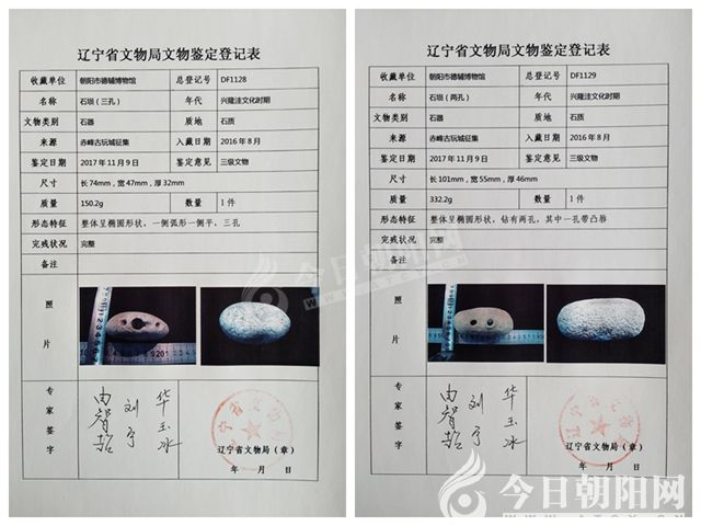 隨后經(jīng)挑選、量尺、拍照、登記文物檔案并進(jìn)行了布展。2017年11月9日,由遼寧省文物局博物館處郭松雪帶領(lǐng),原遼寧省博物館副館長、遼寧省文物鑒定委員會專家由智超、遼寧省博物館副館長、國家文物鑒定委員會專家劉寧、遼寧大學(xué)教授、遼寧省文物鑒定委員會專家華玉冰、原內(nèi)蒙古敖漢旗博物館館長、內(nèi)蒙古文物鑒定委員會專家邵國田應(yīng)邀參加,共同組成鑒定評審專家組,由智超擔(dān)任本次鑒定組組長,對朝陽市德輔博物館的館藏文物進(jìn)行第三次大型定級工作。鑒定評審專家組經(jīng)過兩天緊張而忙碌的工作,以認(rèn)真嚴(yán)謹(jǐn)?shù)膶I(yè)態(tài)度,周密審慎的考古研究,科學(xué)規(guī)范的定級標(biāo)準(zhǔn)為準(zhǔn)繩,對德輔博物館的館藏文物進(jìn)行了嚴(yán)格的甄選和鑒定工作,共有160件(套)文物通過了專家評審,其中國家一級文物5件(套),國家二級文物11件(套),國家三級文物55件(套),一般文物89件(套)。此次定級文物數(shù)量眾多,極大地豐富了文化研究的實(shí)物,填補(bǔ)了考古發(fā)現(xiàn)的空白,為博物館的館藏文物的等級和數(shù)量再創(chuàng)新高。其中,本文提及的一件兩孔石塤和一件三孔石塤均鑒定為興隆洼文化時期遺存,評定為國家三級文物。按照中華人民共和國文物法的規(guī)定,屬于珍貴文物。(圖5、圖6、圖7)