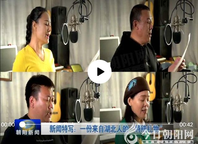 《光明使者》曲作者、朝陽市音協(xié)副主席張凱(左一)和理事張冰(右一)