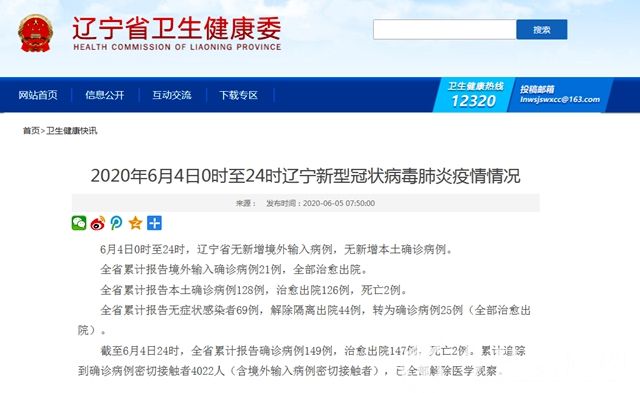 原文鏈接:2020年6月4日0時至24時遼寧新型冠狀病毒肺炎疫情情況