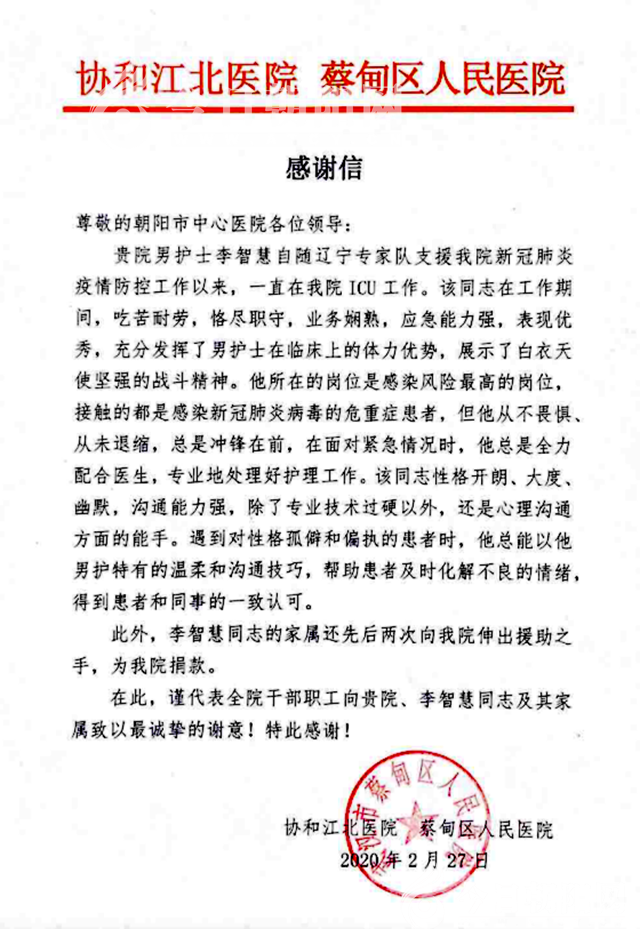 信中寫到:“貴院男護(hù)士李智慧在工作期間,吃苦耐勞,恪盡職守,業(yè)務(wù)嫻熟,應(yīng)急能力強(qiáng),充分發(fā)揮了男護(hù)士在臨床上的體力優(yōu)勢,展示了白衣天使堅強(qiáng)的戰(zhàn)斗精神。他所在的崗位是感染風(fēng)險最高的崗位,接觸的都是感染新冠病毒的危重癥患者,但他從不畏懼、從未退縮,總是沖鋒在前。該同志性格開朗,除了專業(yè)技術(shù)過硬以外,還是心理溝通方面的能手……”短短的一封信里滿滿都是對抗疫戰(zhàn)士工作的肯定。