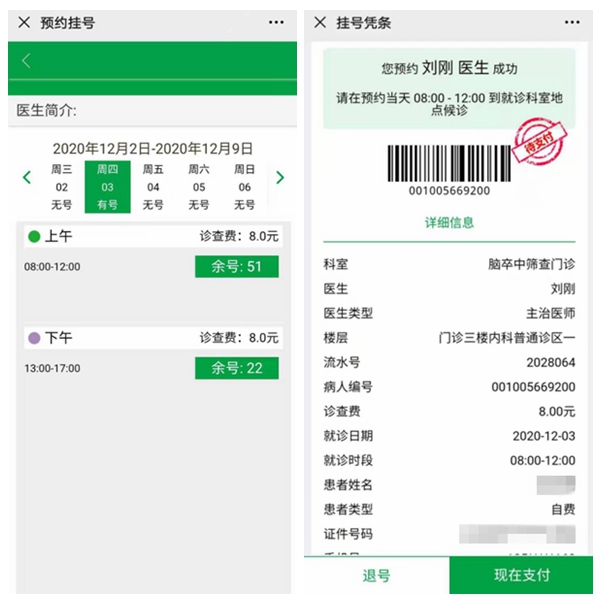 選擇醫(yī)生后,點擊進入選擇就診日期和時段頁面,選擇有余號的時間段掛號,確定后支付掛號費,完成預(yù)約。