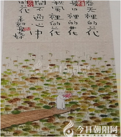 老樹有幅畫:一簾木道長入水,權(quán)做碼頭;一人銀帽白衫,懷抱鮮花,面向荷塘。那里,荷葉田田,點綠潑黃,預示著秋盡,冬涼。他題寫偈語般詩行:“春天里的花,夏日里的花,秋風里的花,開不過心中的花。”