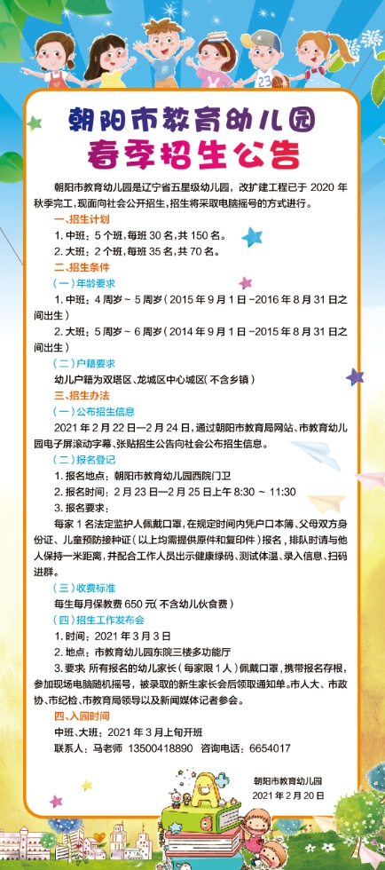 根據(jù)疫情防控常態(tài)化要求以及擴(kuò)建實(shí)際情況,該園現(xiàn)面向社會(huì)公開招收中班、大班新生。其中,中班計(jì)劃招生150人,大班計(jì)劃招生70人。報(bào)名時(shí)間為2021年2月23日至2月25日上午8點(diǎn)30分至11點(diǎn)30分。為更好地服務(wù)廣大市民,本網(wǎng)現(xiàn)予編發(fā)該園《春季招生公告》,敬請各位網(wǎng)友轉(zhuǎn)發(fā)。