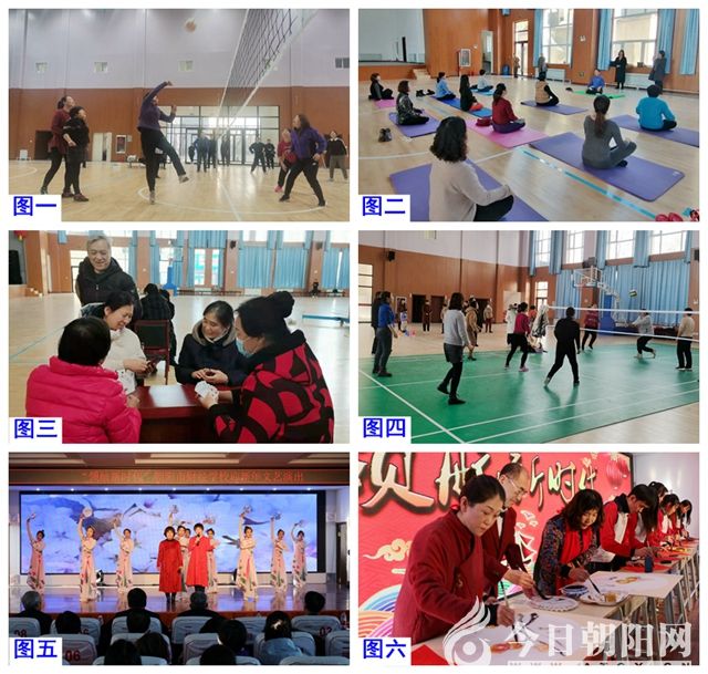 ?。▓D一:女教工排球賽;圖二:瑜伽練習(xí);圖三:棋牌競技;圖四嘗試打氣排球;圖五表演現(xiàn)代京??;圖六:書畫迎春)